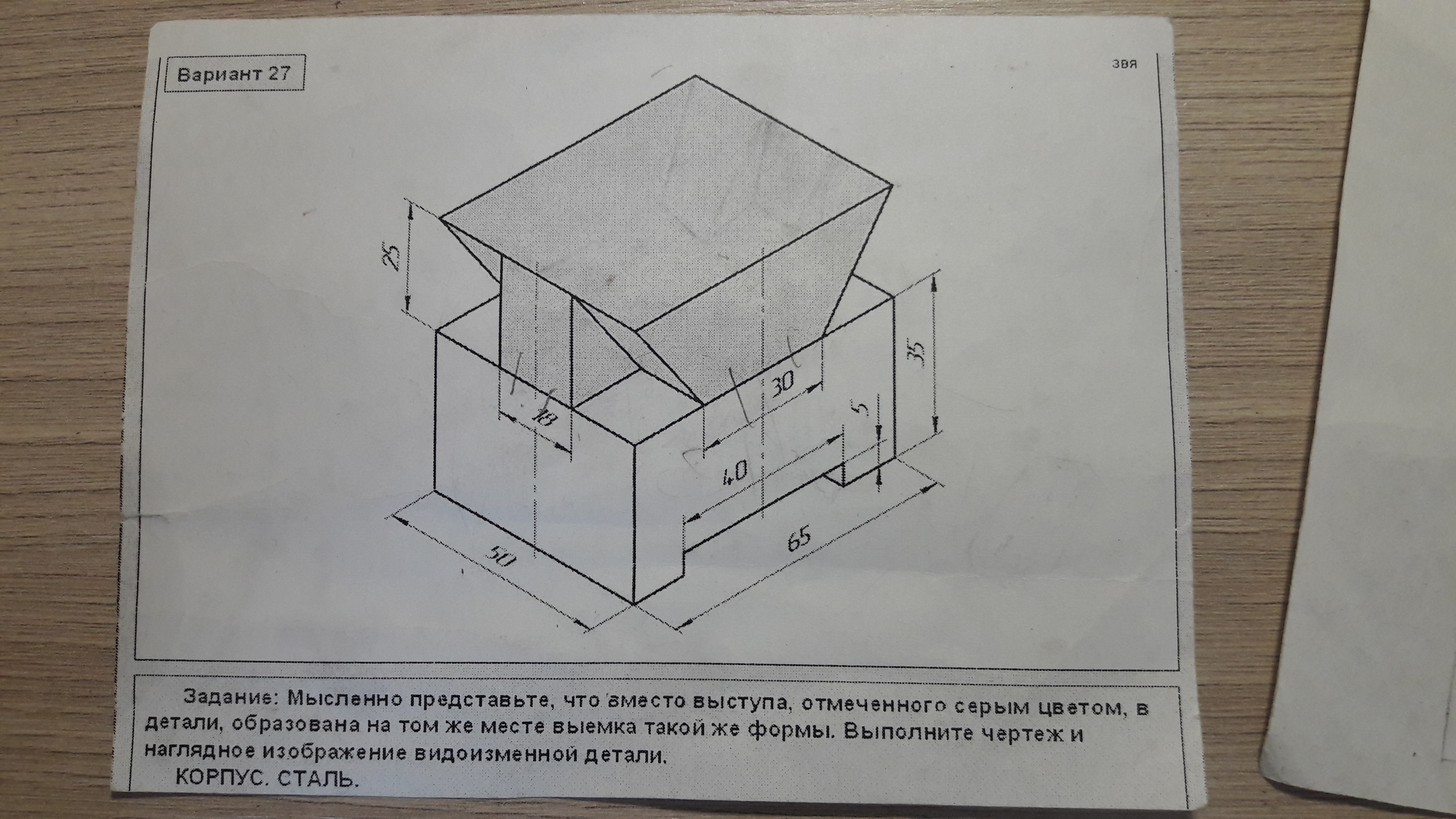 Вариант 27 Задание:Мысленно представьте,что вместо выступа,отмеченного серым цветом,в детали,образована на том же месте выемка такой же формы.Выполните чертёж и наглядное изображение видоизменной детали.Корпус.Сталь.