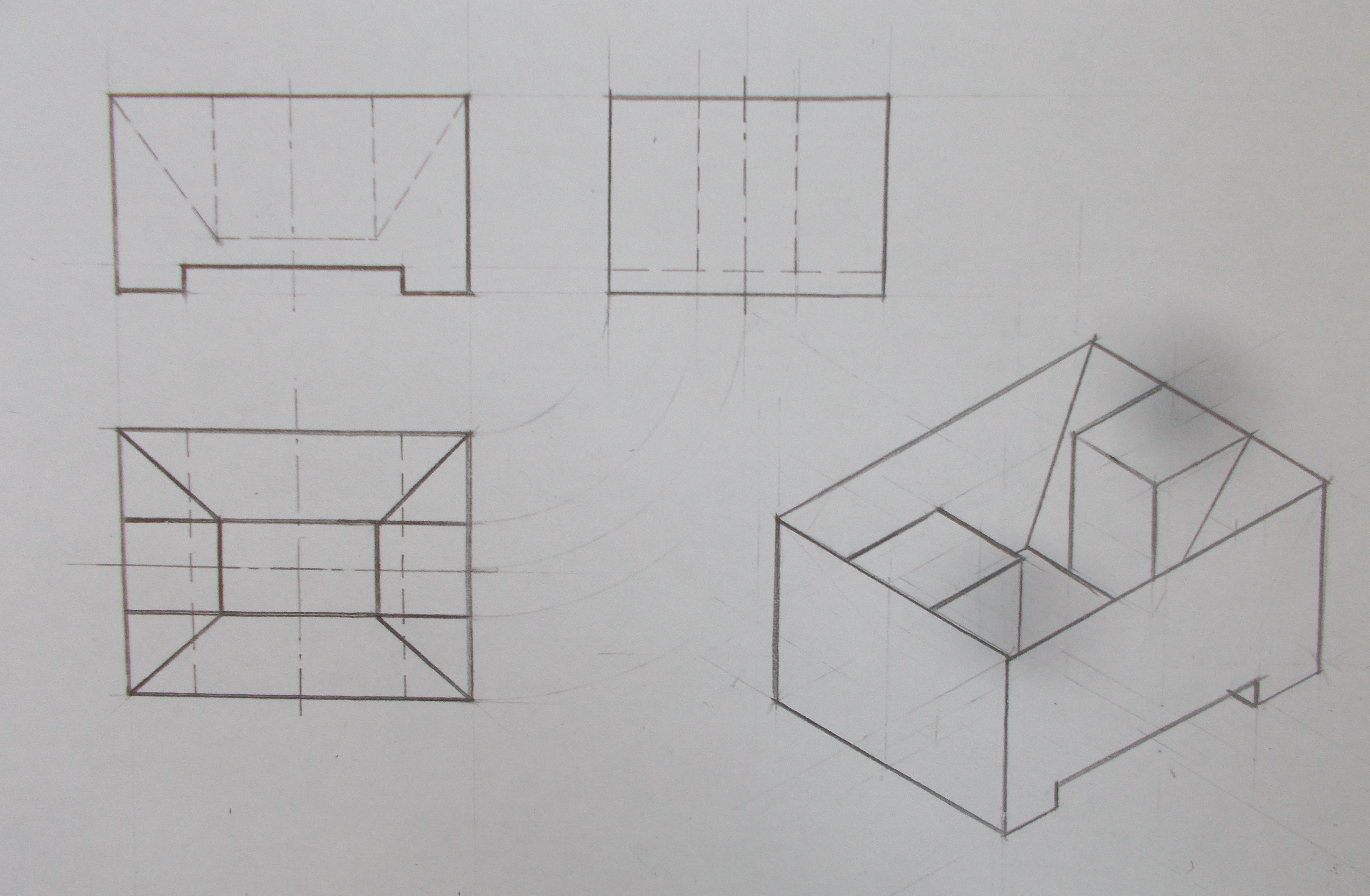 Если в этом задании не выполнять разрезы на чертеже, а вырез на наглядном изображении, то задача будет решена таким образом, как показано на рисунке.