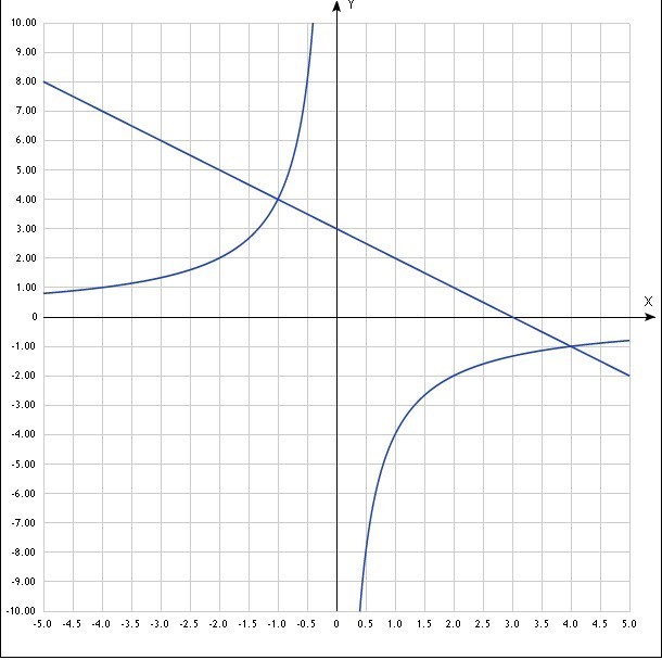 Найдите координаты точек пересечения графиков функций y=-4:x и y=3-x изобразите графики этих функций и отметьте найденные точки?