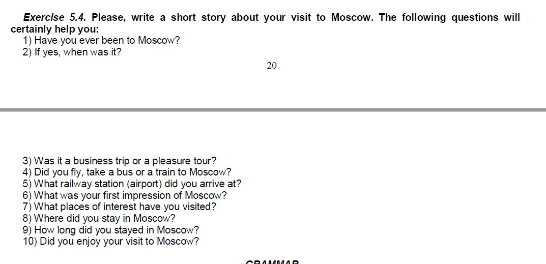 I have been to Moscow several times. Last time I was there in September. It was a pleasure tour. I flew there. I arrivet at the Domodedovo airport. My first imperssion of Moscow was that it is a very busy city. I visited the Red square and some museums. While I was there I stayd at my granny's house. I stayed there for 4 days. I enjoyed the visit very much.