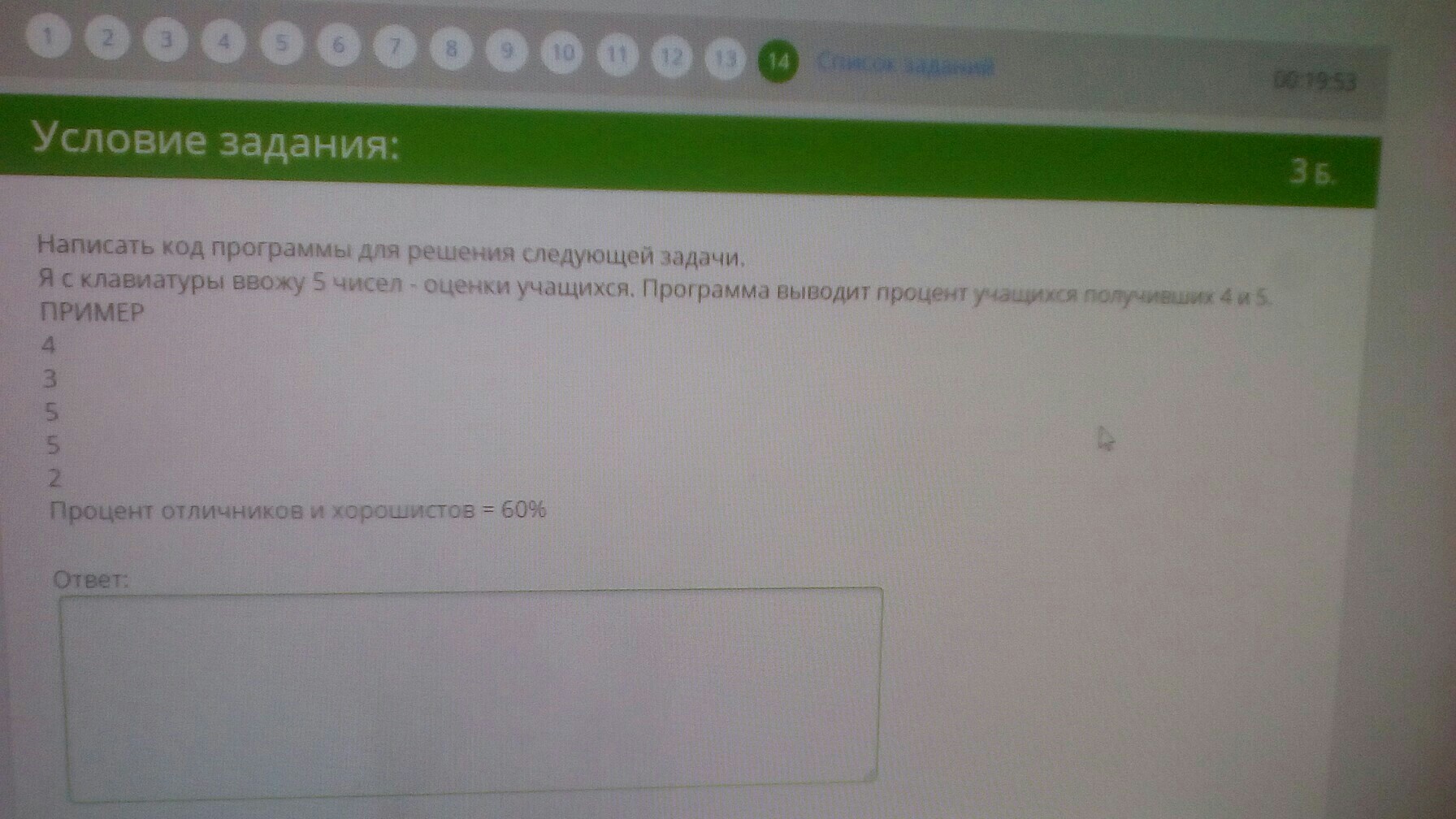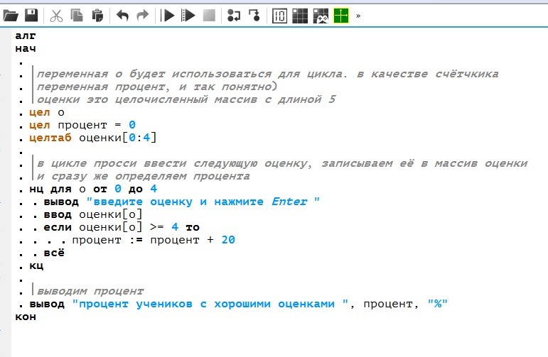 вывод "Процент отличников и хорошистов = ", int(0.5+а*100/5), "%"