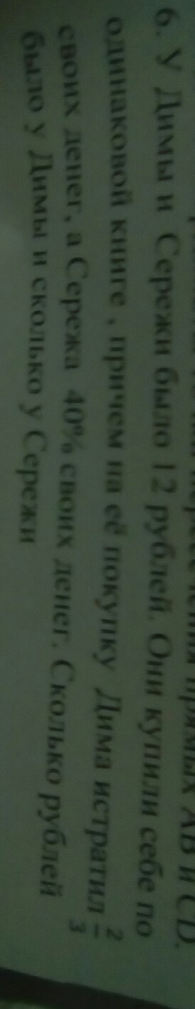 у Димы и Сережи было 12 руб. Они купили себе по одинаковые книги причём на покупку Дима истратил 2/3 своих денег а Серёжа 40% своих денег сколько рублей было у Димы сколько рублей было у Серёжи