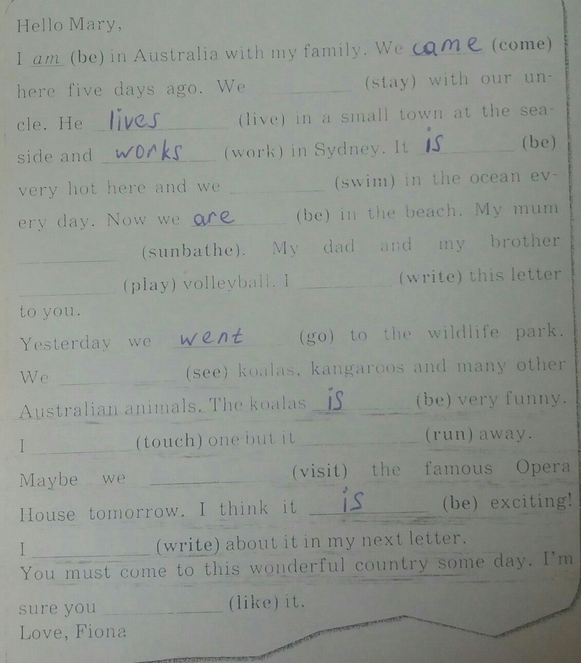 Yesterday we went to the wildlife park. We saw coalas, kangaroos and many other Australian animals. The coalas is very funny. I touched one but it ran away. Maybe we will visit the famous Opera House tomorrow. I think it will be exciting. I will write about it in my next letter.