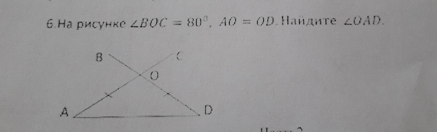 Как мы знаем сумма углов треугольника 180 градусов значит надо 180-80=100 и 100:2=50 градусов ответ:50 градусов угол oad