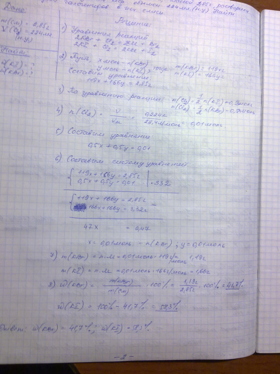 Навеску смеси калий йода и калий бромида массой 2,85г растворили в воде и пропустили хлор объемом 224мл(н.у)найти массовые доли галогенидов в смеси.Помогите пожалуйста решить!!!