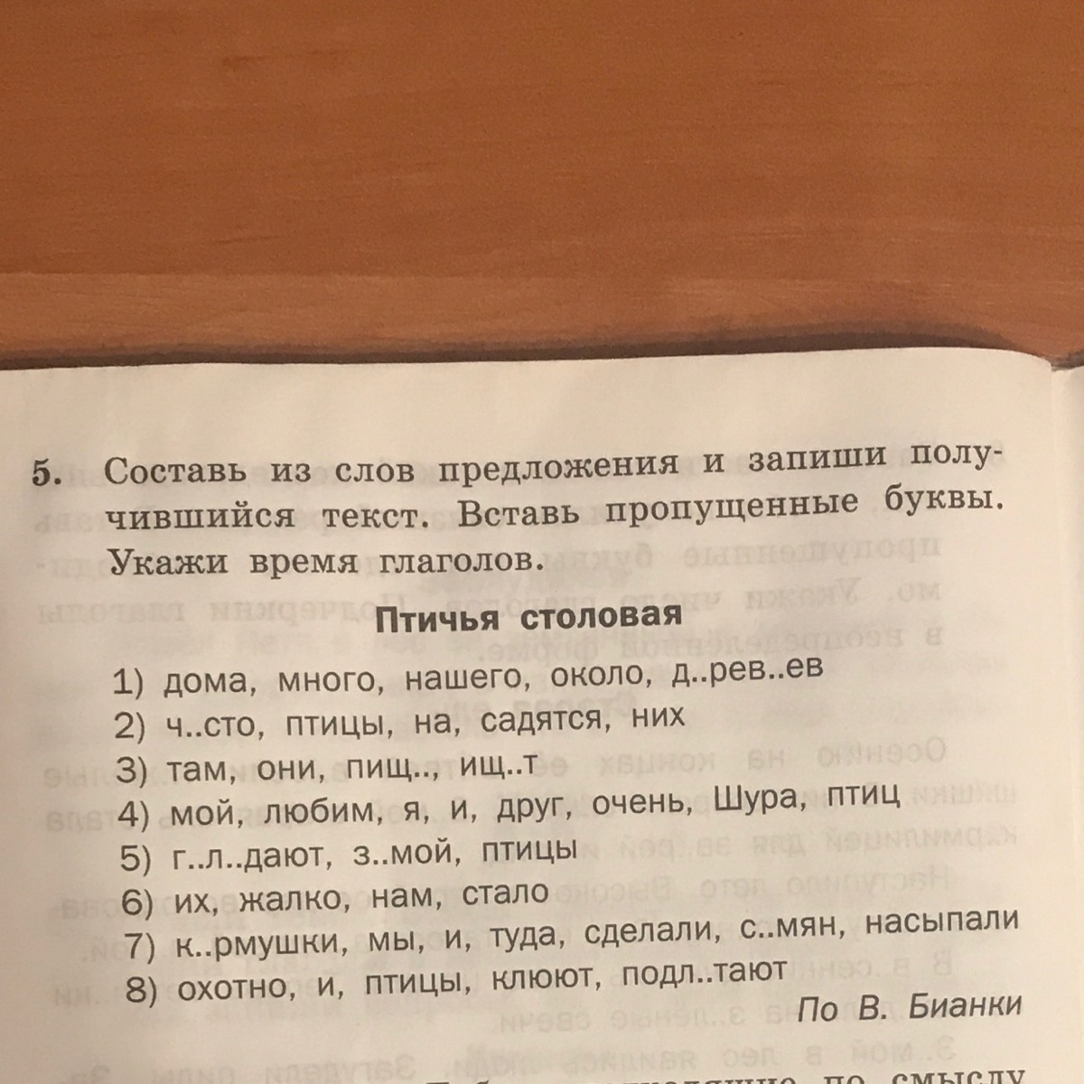 Около нашего дома много деревьев.На них часто садятся(наст вр ) птицы. Там они ищут(наст вр) пищу. Я и мой друг шура очень любим(наст вр) птиц.Зимой птицы голодают(наст вр)нам их стало жалко.Мы сделали(прош вр) кормушки и насыпали(прош вр) туда семян.Птицы подлетают(наст вр) и охотно клюют(наст вр).
