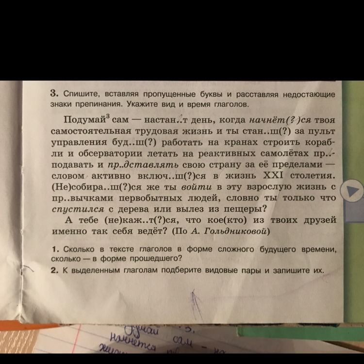 Подумай сам- настанЕт день, когда начнётся твоя самостоятельная трудовая жизнь и ты станЕшЬ за пульт управления. БудЕшЬ работать на кранах, строить корабли и обсерватории летать на реактивных самолётах, прЕподавать и прЕдставлять свою страну за её пределами-словом активно включИшЬся в жизнь XXI столетия. НЕ собираЕшЬся же ты войти в эту взрослую жизнь с прИвычками первобытных людей, словно ты только что спустился с дерева или вылез из пещеры?