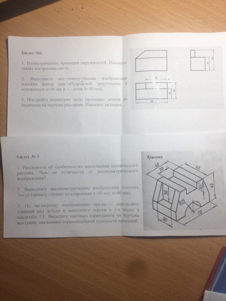 Билет № 8 1. Технический рисунок, в отличии от аксонометрической проекции, выполняется от руки на глаз с соблюдением пропорций предмета. При выполнении рисунка соблюдаются правила аксонометрии изометрические оси с углами между ними 120° и оси фронтальной диметрии с углами 45° и 90° от горизонтальной оси.