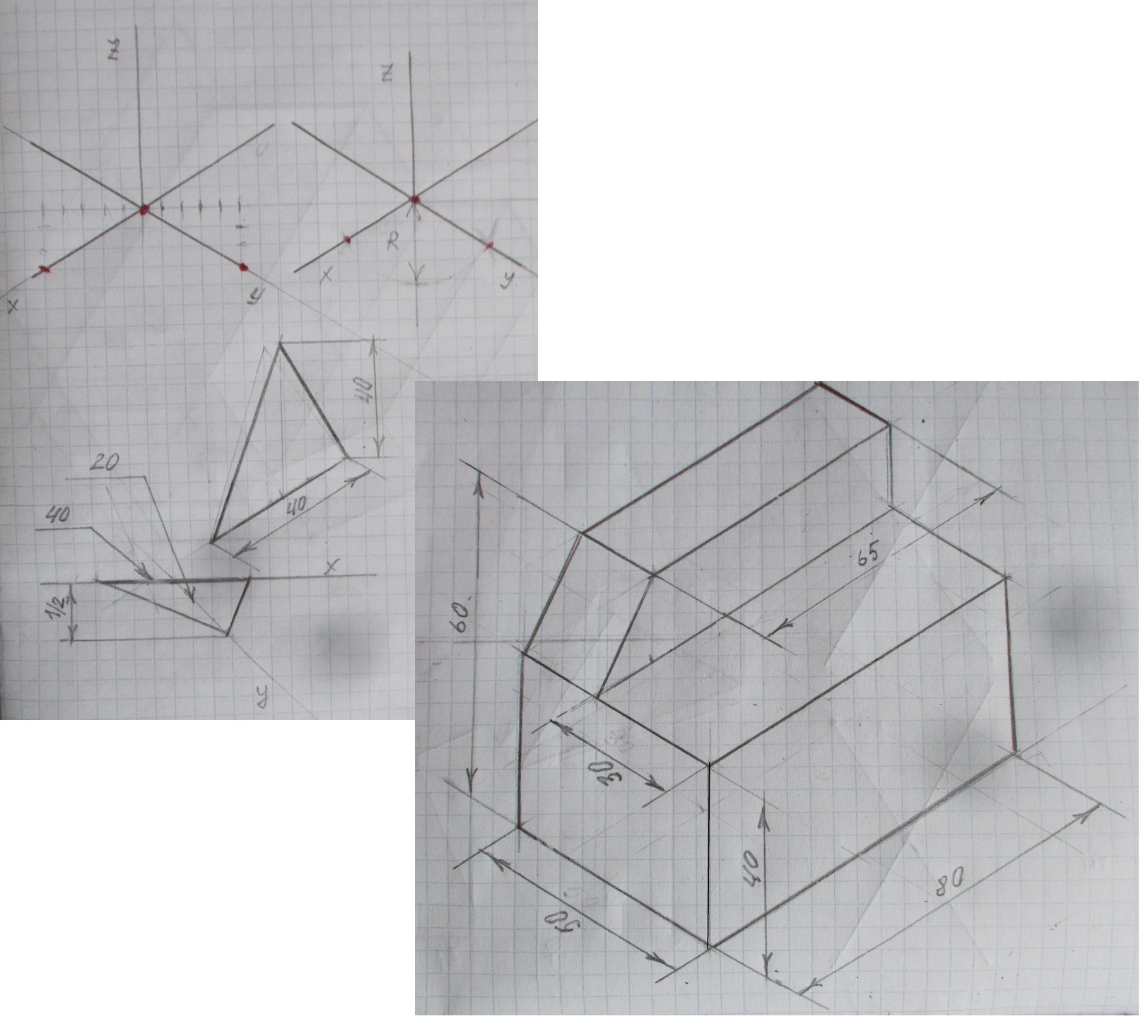 2-3. Выполнение аксонометрических проекций фигур и аксонометрической проекции по заданным на чертеже размерам показано на рис.1.