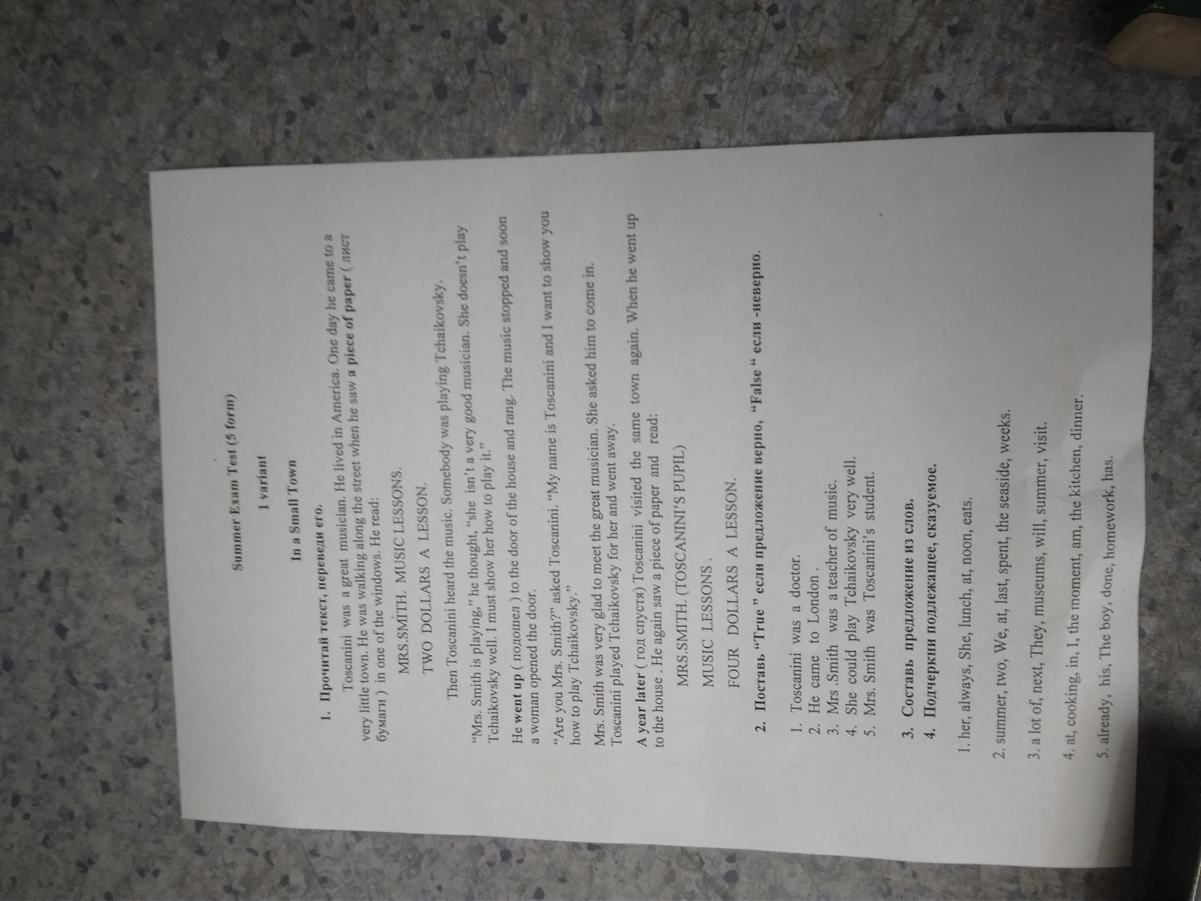 Тосканини был великим музыкантом.Он жил в Америке.Однажды он приехал в очень маленький город.Он гулял по улице, когда он увидел лист бумаги в одном из окон. Он прочитал: