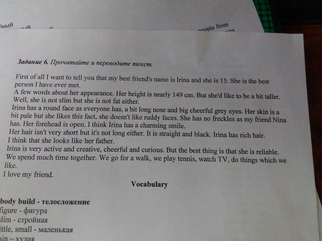 Первым из всех, я бы хотел сказать вам, что имя моего лучшего друга - Ирина, ей 15 лет. Она - лучший человек, которого я когда-либо. Рассказываю о ее внешности. Ее высота почти 149 см. Но она хотела бы быть немного выше. Ну, она не тонкая, но и не жирная. имеет круглое лицо, как у всех, немного длинный нос и большие жизнерадостные серые глаза. Ее кожа бледная, ей нравится это, ей не нравятся румяные лица. У нее нет веснушек, как у моей подруги Нины. Ее лоб открыт. Я думаю, что у Ирины очаровательная улыбка. Ее волосы не очень короткие, но и не длинные . Они прямые и чёрные . У Ирины богатые родители., она похожа на своего отца. Ирина очень активная и творческая, веселая и любопытная. Но самое лучшее, что она надежна. Мы проводим много времени вместе. Мы гуляем, играем в теннис, смотрим телевизор, делаем то, что нам нравится. любите моего друга.