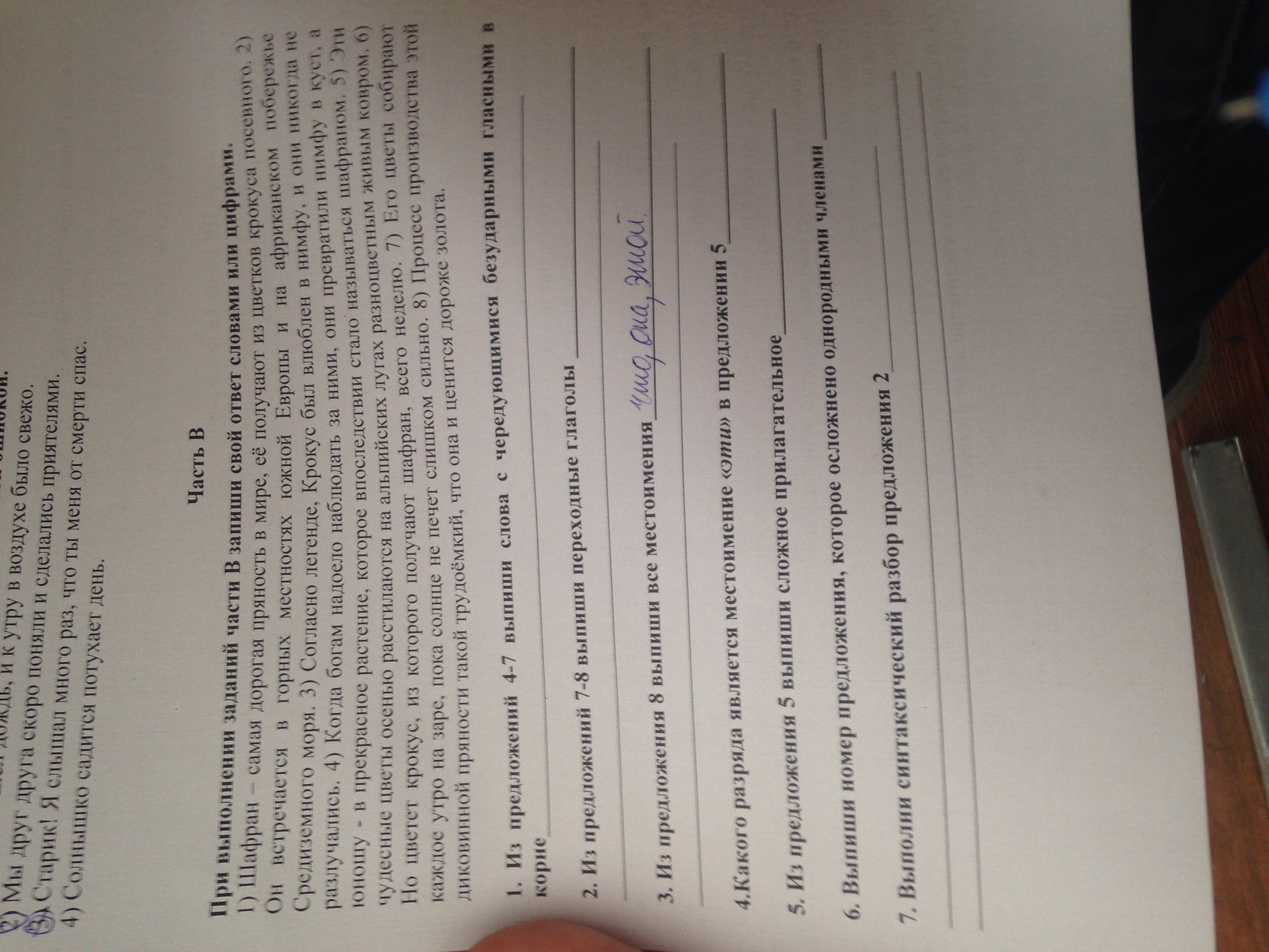 1.Растение,расстилаются,собирают,заре... 2.Не печёт,ценится... 3.Этой,такой,что,она... 4.Указательное... 5.Разноцветным... 6-2)...7.Он(подлежащее,выражено местоимением) встречается(сказуемое,выражено глаголом) в горных(определение,выражено прилагат.) местностях(обстоятельство,выражено сущ.) южной(определение,выражено прилагат.) Европы(дополнение,выражено сущ.) и(союз) на африканском(определение,выражено прилагат.) побережье(обстоятельство,выражено сущ.) Средиземного(определение,выражено прилагат.) моря(дополнение,выражено сущ.).Это повест.,невоскл. простое двусоставное распространённое предложение,осложнённое однородными обстоятельствами.