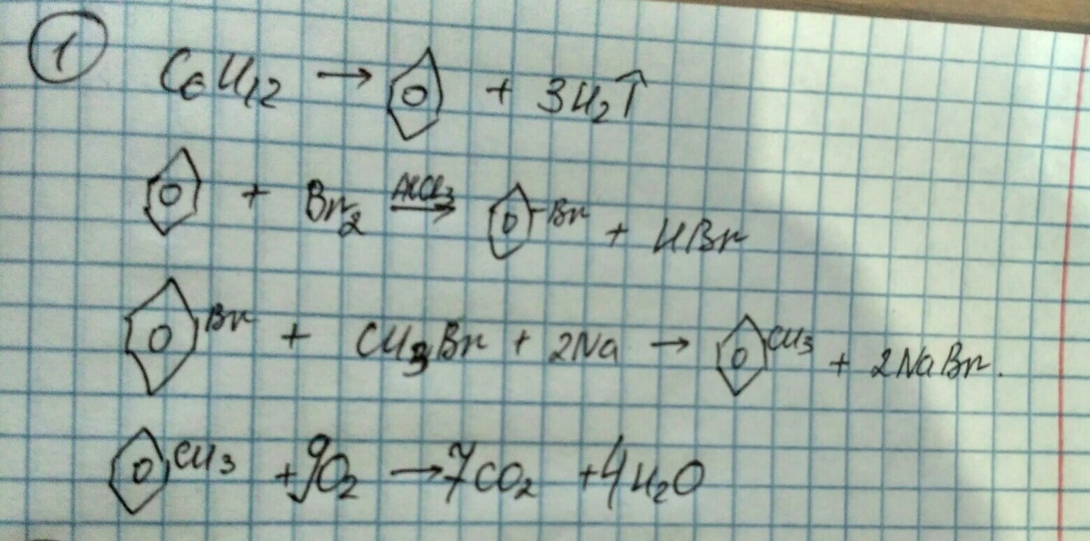 Сделать преобразование. С6Н12-С6Н6-С6Н5Br-C6H5CH3-CO2 и гептан-гептан-гептанол-гептаналь-гептановая кислота
