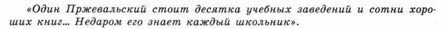 В наше больное время, когда европейскими обществами обуяли лень, скука жизни и неверие, когда всюду в странной взаимной комбинации царят нелюбовь к жизни и страх смерти, когда даже лучшие люди сидят сложа руки, оправдывая свою лень и свой разврат отсутствием определенной цели в жизни, подвижники нужны, как солнце. Составляя самый поэтический и жизнерадостный элемент общества, они возбуждают, утешают и облагораживают. Их личности — это живые документы, указывающие обществу, что кроме людей, ведущих споры об оптимизме и пессимизме, пишущих от скуки неважные повести, ненужные проекты и дешевые диссертации, развратничающих во имя отрицания жизни и лгущих ради куска хлеба, что кроме скептиков, мистиков, психопатов, иезуитов, философов, либералов и консерваторов, есть еще люди иного порядка, люди подвига, веры и ясно сознанной цели. Если положительные типы, создаваемые литературою, составляют ценный воспитательный материал, то те же самые типы, даваемые самою жизнью, стоят вне всякой цены. В этом отношении такие люди, как Пржевальский, дороги особенно тем, что смысл их жизни, подвиги, цели и нравственная физиономия доступны пониманию даже ребенка. Всегда так было, что чем ближе человек стоит к истине, тем он проще и понятнее. Понятно, чего ради Пржевальский лучшие годы своей жизни провел в Центральной Азии, понятен смысл тех опасностей и лишений, каким он подвергал себя, понятны весь ужас его смерти вдали от родины и его предсмертное желание — продолжать свое дело после смерти, оживлять своею могилою пустыню... Читая его биографию, никто не спросит: зачем? почему? какой тут смысл? Но всякий скажет: он прав.
