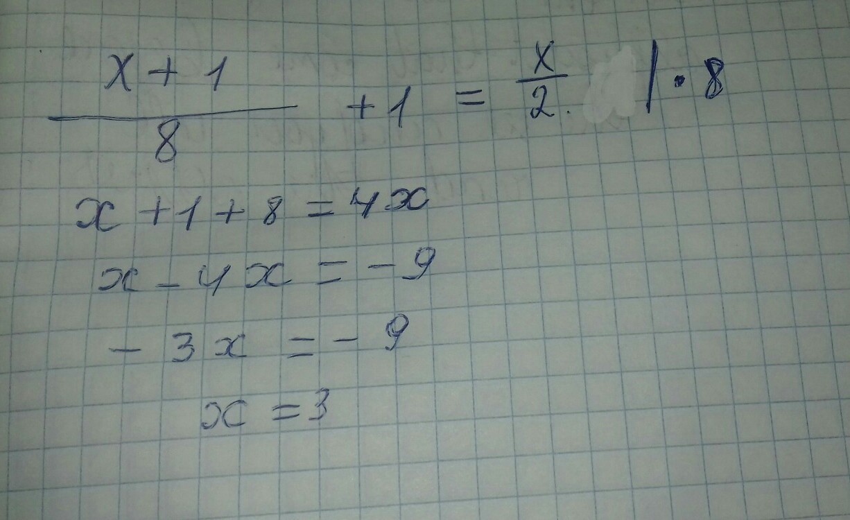 Помогите решить уравнение дробь в числителе Икс плюс 1 в знаменателе 8 потом плюс 1 равно числитель X знаменатели 2.