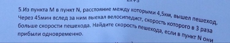 Пусть х скорость пешехода, тогда скорость велосипедиста 3х. Время затраченное пешеходом на весь путь 4,5/х, а время затраченное велосипедистом на весь путь 4,5/3х. Нам известно, что велосипедист выехал на 45 мин ( 3/4 =0,75 часа) позже, чем вышел пешеход . Тогда составим уравнение: