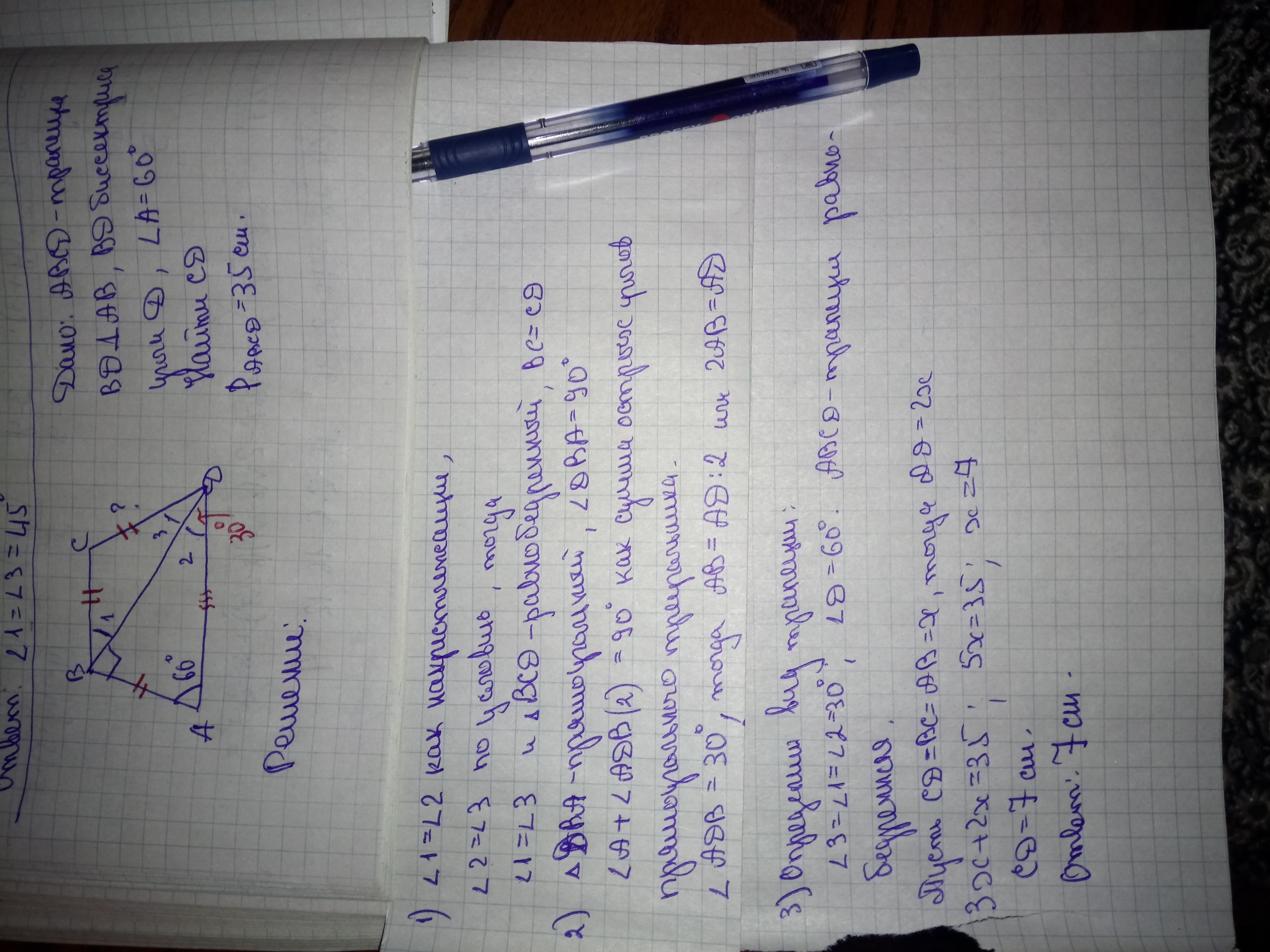 авсд трапеция вд перпендикулярен ав,вд биссектриса угол д угол а равен 60 градусам периметр трапеции равен 35 см. Найдите сд