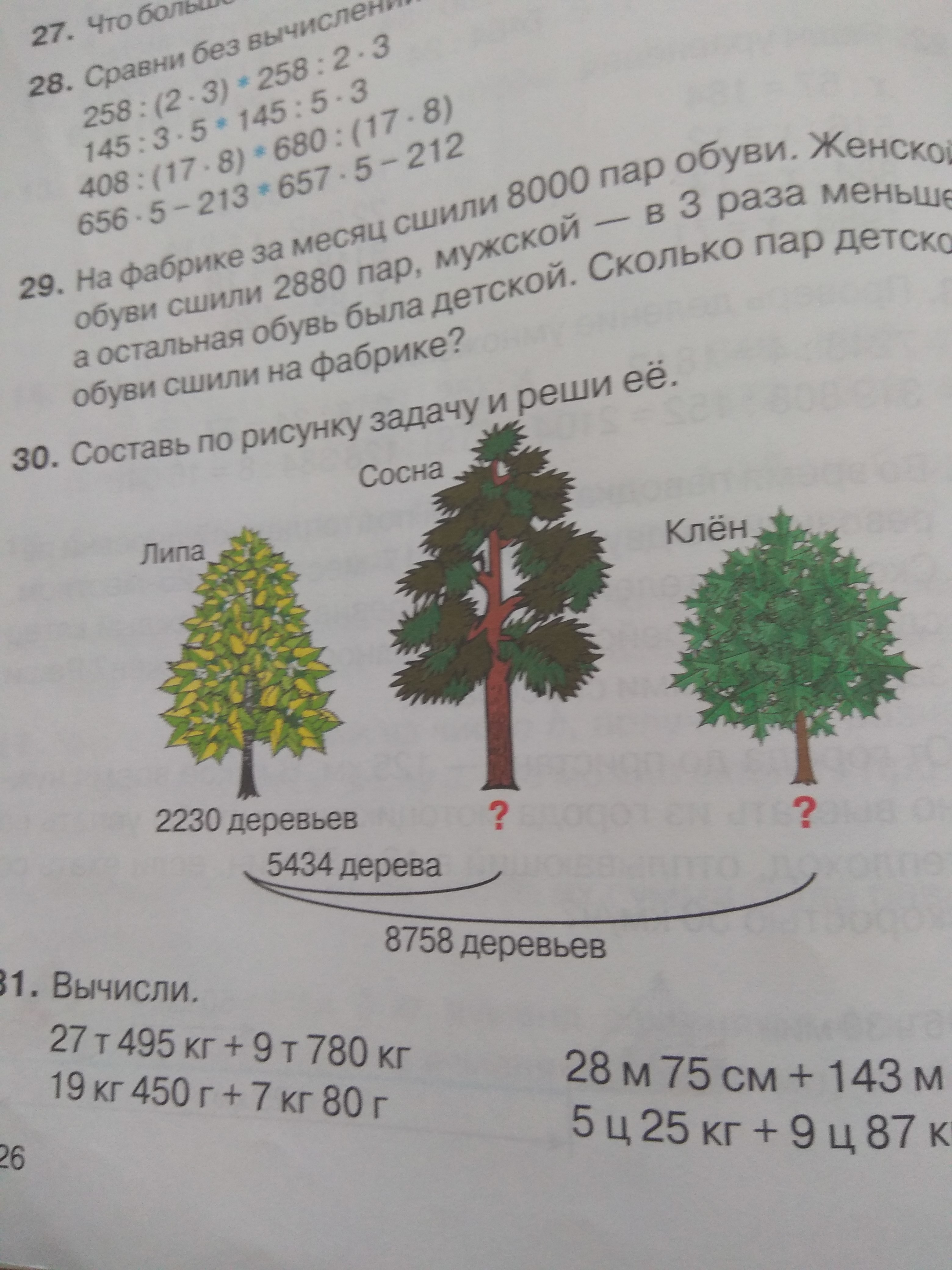 Липыбыло 2230д, а сосны и липы вместе - 5434 дерева. Всего деревьев 8758д. Сколько было деревьев сосны и клена