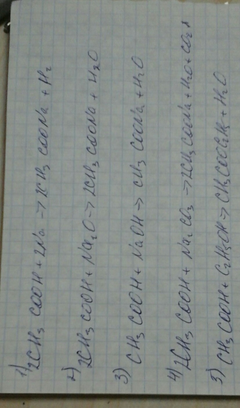 Напишите уравнения реакций взаимодействия уксусной кислоты с 1)натрием, 2)оксидом натрия, 3)гидроксидом натрия, 4)карбонатом натрия и с 5)этиловым спиртом.?