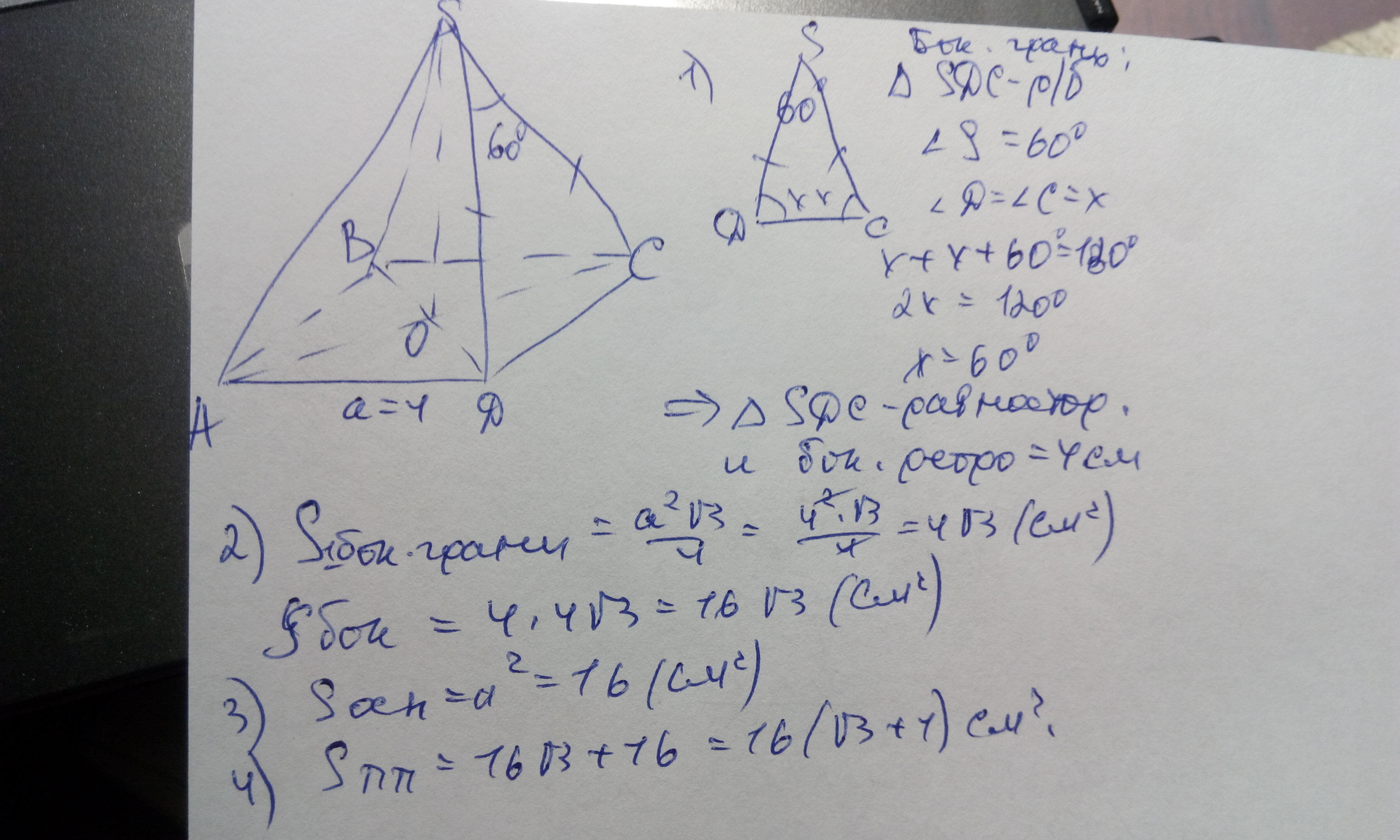 Сторона основания четырёхугольной пирамиды равна 4см, а плоский угол при вершине пирамиды 60 градусов. найдите площадь полной поверхности пирамиды.