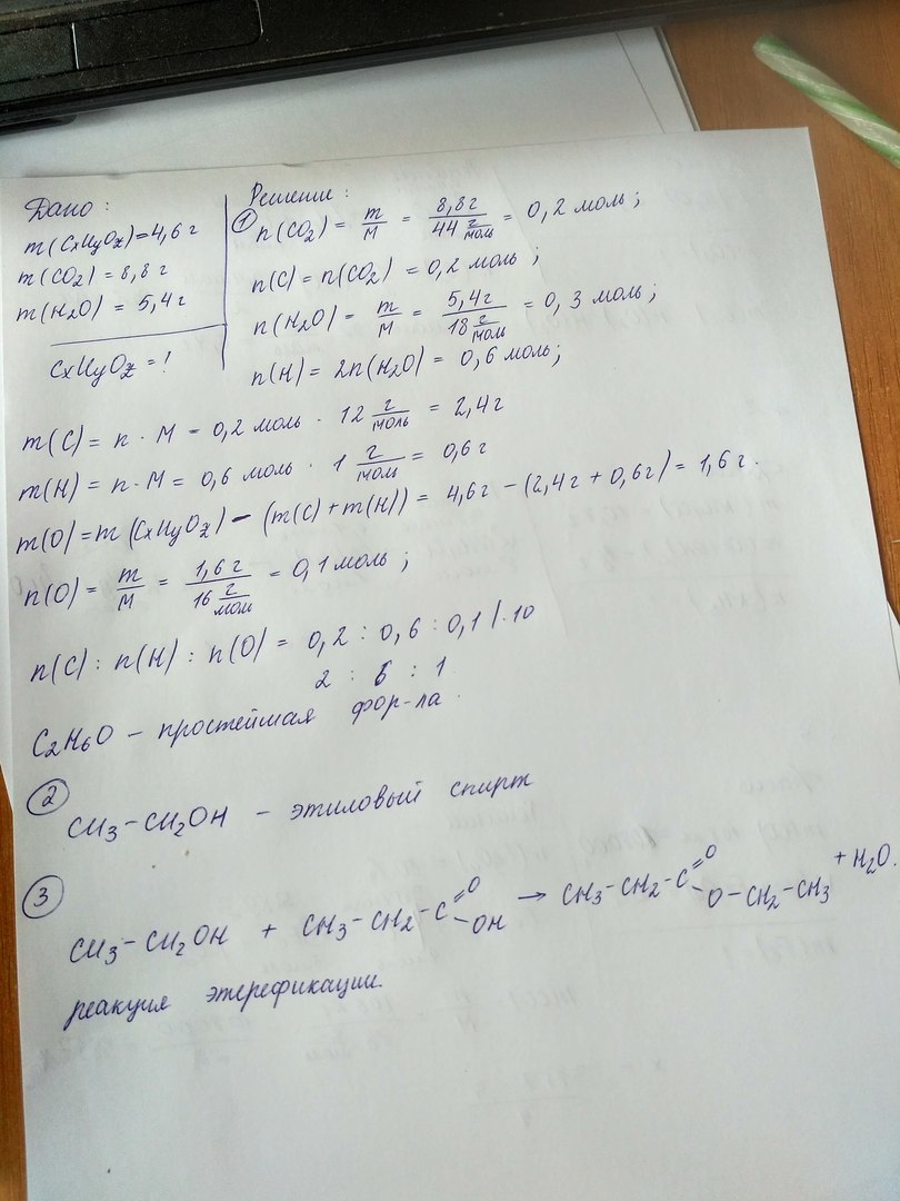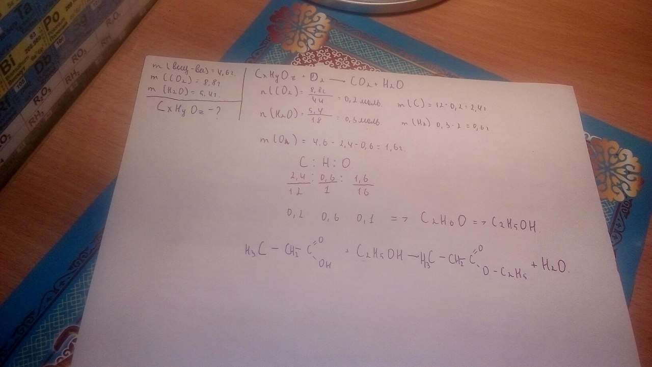 При полном сгорании 4,6г газообразного органического вещества получено 8,8г углекислого газа и 5,4г воды. Указанное вещество жидкое при н.у., реагирует с металлическим натрием и пропионовой кислотой. На основании этих данных установите формулу органического вещества, составьте структурную формулу и приведите уравнения реакции его взаимодействия с пропионовой кислотой.