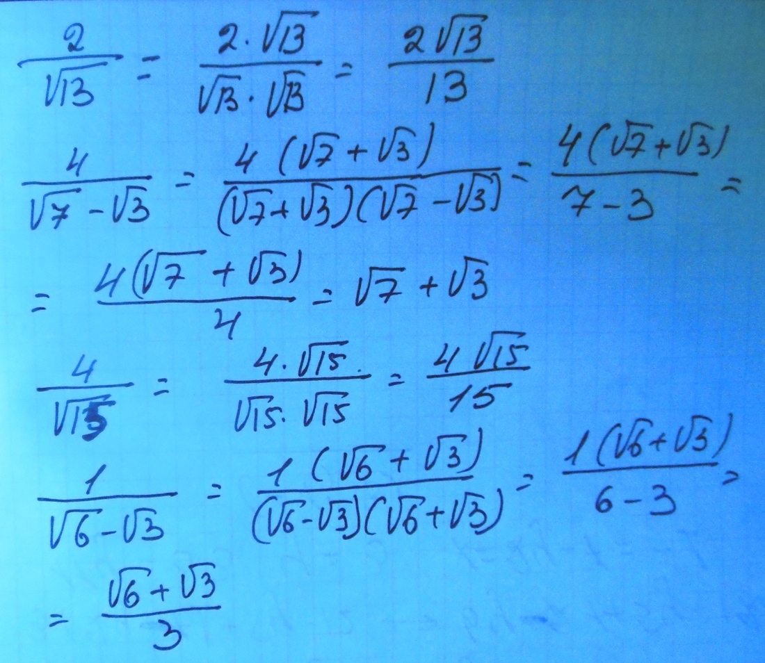 освободитесь от иррациональности в знаминателе дроби а) 2/корень 13 б) 4/корень 7 - корень 3 в) 4/ корень 15 г) 1/корень 6 - корень 3