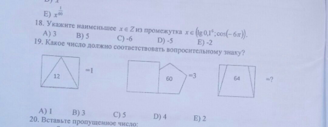 18.Дан промежуток ( log(0,1^{-6}) ; cos( -6*π) ) в котором надо найти наименьшее число - понятно что оно будет равно логарифму, т.к. он левее =)