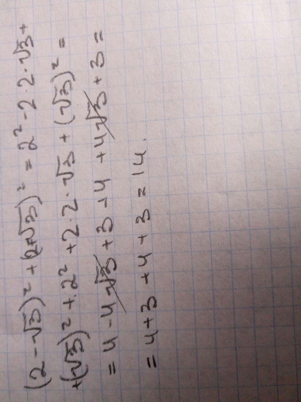 (2-√ 3)^2+(2+ √3)^2=4 - 4√3 + 3 + 4 + 4√3 +3 = 4+3+4+3=14