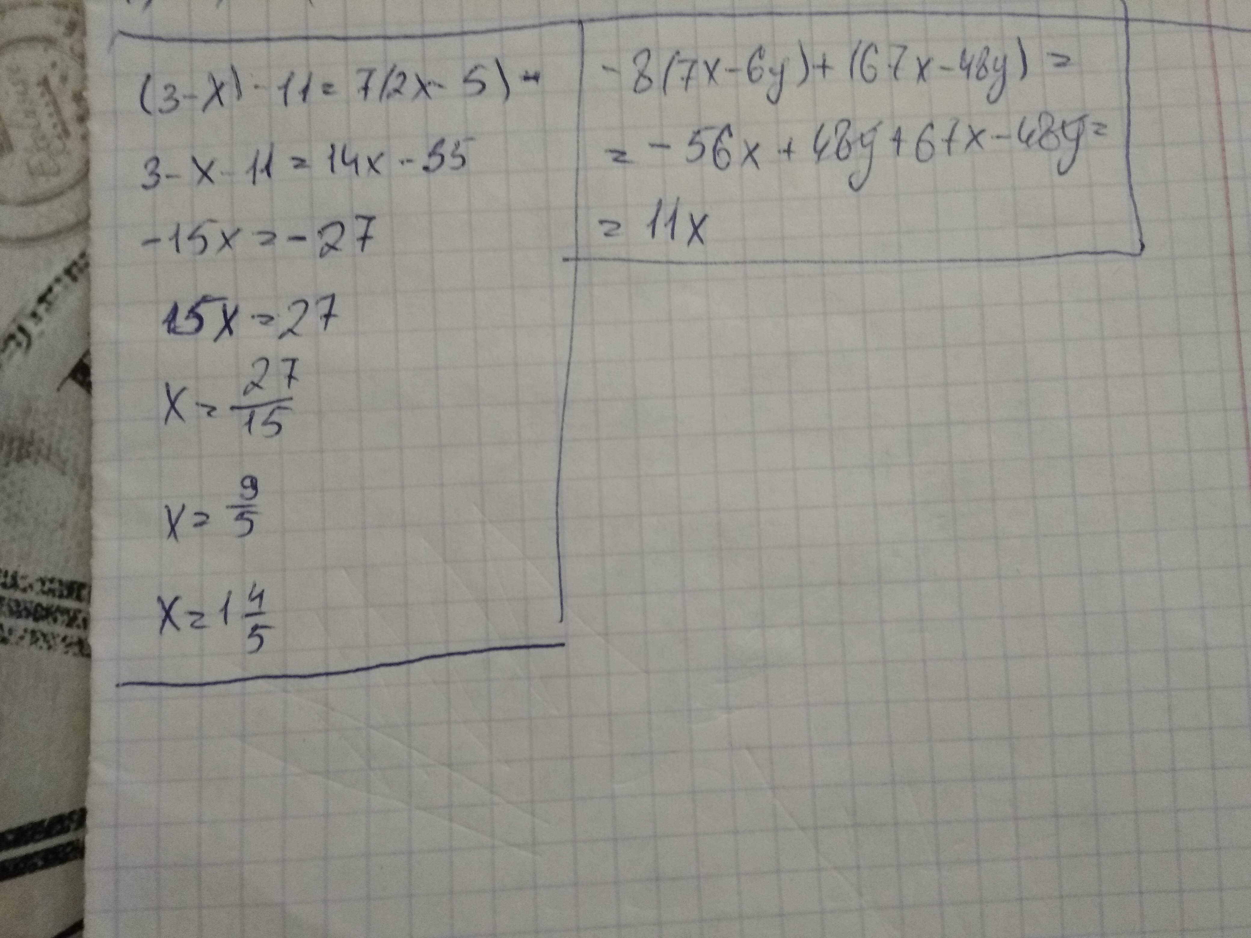 -8(7х-6у)+(67х-48у)=-56х+48у+67х-48у=11х