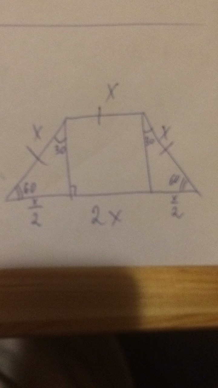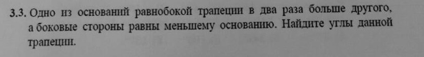 Пусть меньшее основание х, а большее 2х, тогда боковые стороны тоже по х. Опустим перпендикуляры на большее основание и получим 2 равных прямоугольных треугольника с гипотенузой =х (боковая сторона) и катетом х/2. Если в прямоугольном тр. катет равен половине гипотенузы, то он лежит против угла в 30 градусов, значит острые углы трапеции= по 60 градусов, а тупые по 90+30=120 градусов (или можно так 180-60=120, так как основания параллельны, то сумма односторонних углов=180)