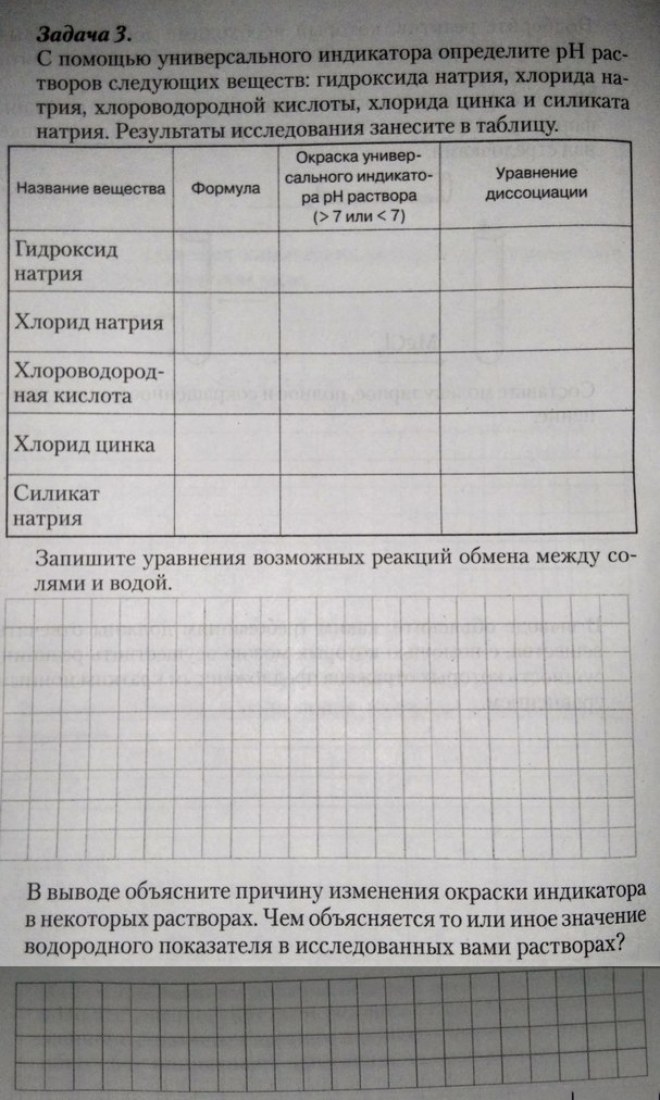 С помощью универсального индикатора определите _{p}H растворов следующих веществ: гидроксида натрия, хлорида натрия, хлороводородной кислоты, хлорида цинка и силиката натрия.
