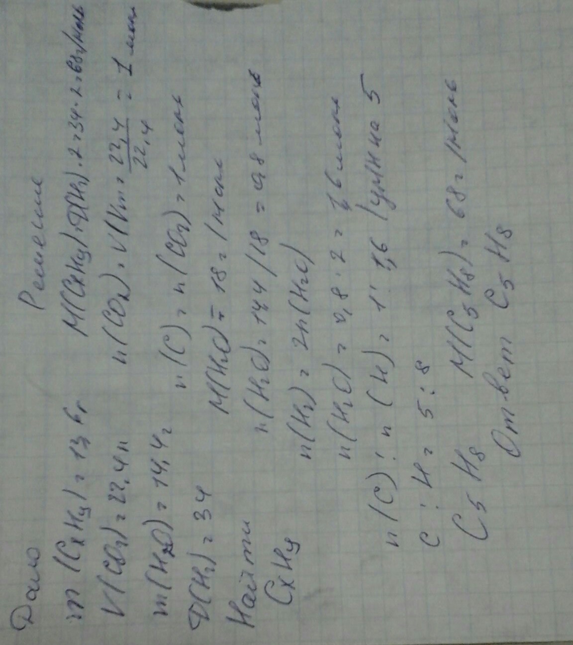 выведите формулу вещества если при сгорании его массой 13,6г образовался оксид углерода 4 объемом 22,4л и вода массой 14,4г. плотгость вещества по водороду равна 34