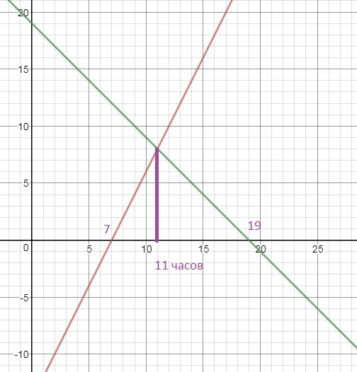 Поэтому движение первого задается графиком у=2х и начинается в точке 7 по оси ох, движение второго, графиком у= -х и начинается в точке 19.