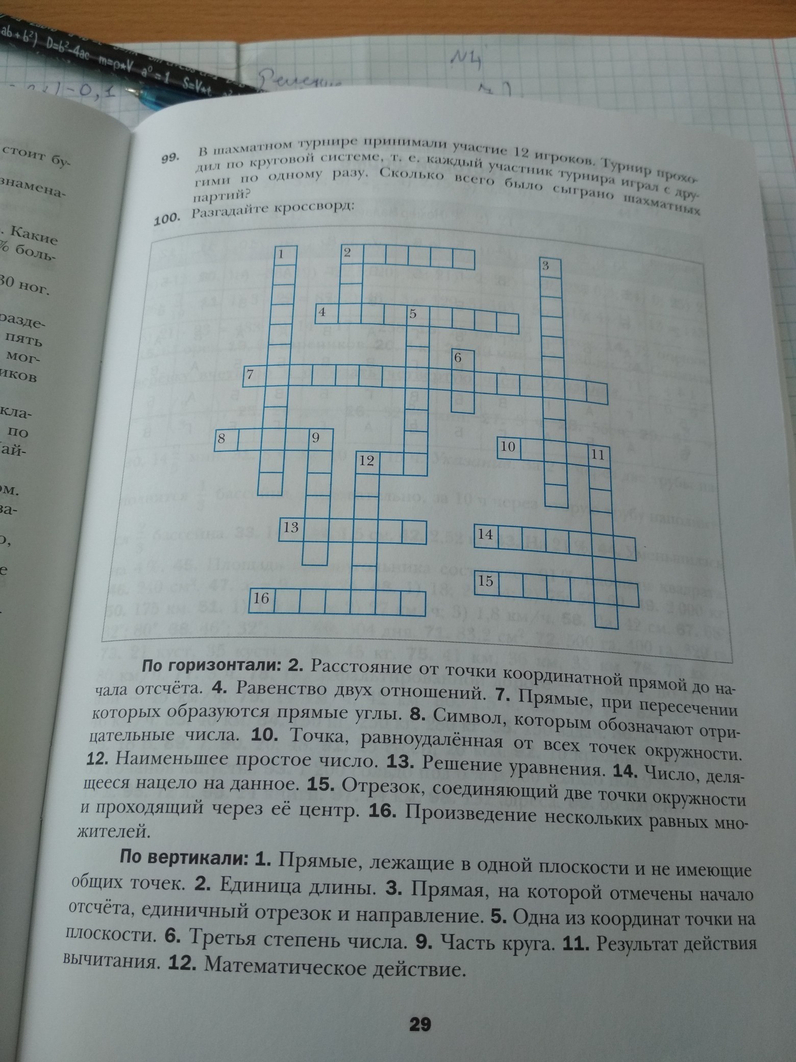 По горизонтали: 2. Модуль 4. Пропорция 7. Перпендикулярные 8. Минус 10. Центр 12. Два 13. Корень 14. Кратное 15. Диаметр 16. Степень