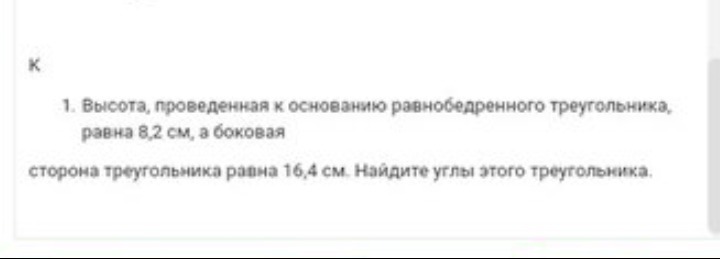 ABH -прямоугольный треугольник. так как BH = 8,2 и AB= 16,4, то угол A = 30 градусов (против катета (который равен половине гипотенузе) лежит угол равный 30 градусов). угол A = угол С потому что ABC равнобедренный, значит 180 -60 =120 = угол B
