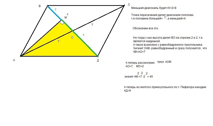 Определить стороны параллелограмма большая диагональ которого равна 14 дм, а меньшая делится перпендикуляром,опущенным на неё из вершины острого угла,на отрезки, равные 2 дм и 6 дм