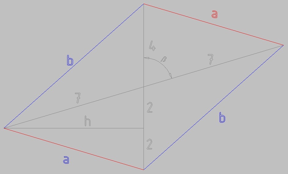 a² = 4² + 7² - 2*4*7*cos(β) - теорема косинусов для короткой стороны