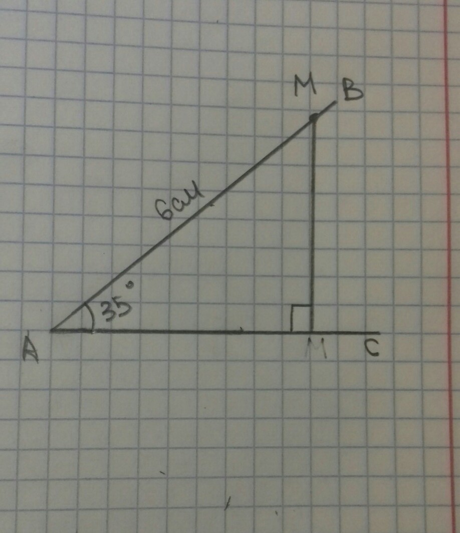построй с помощью транспортира угол ВАС равный 35° и отложите на лучи АВ отрезок АМ длиной 6 см используя треугольник , провнедите через точку М прямую, перпендикулярную АС и пересекающую луч АВ