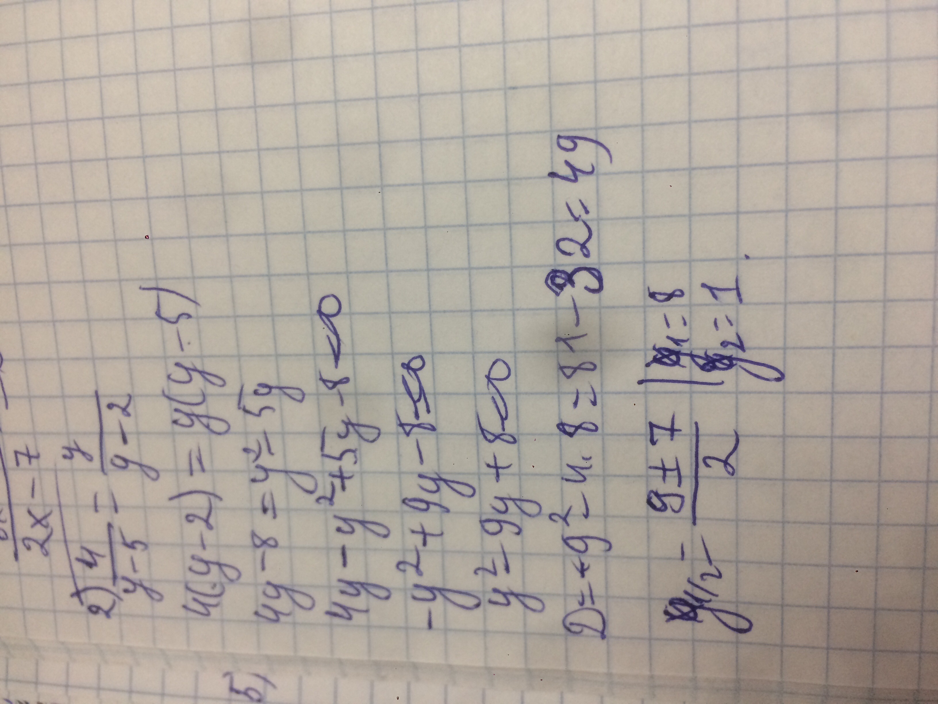 Решите уравнения: 1) 5x-x/2x-7+2x/7-2x=0 2)4/y-5=y/y-2 3)x+2/x-2=x-4/x+3 Если кто не понял вот этот знак "/" это дробь.