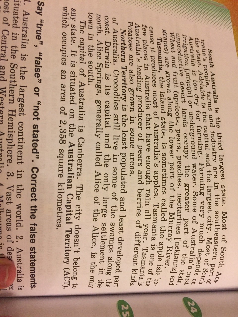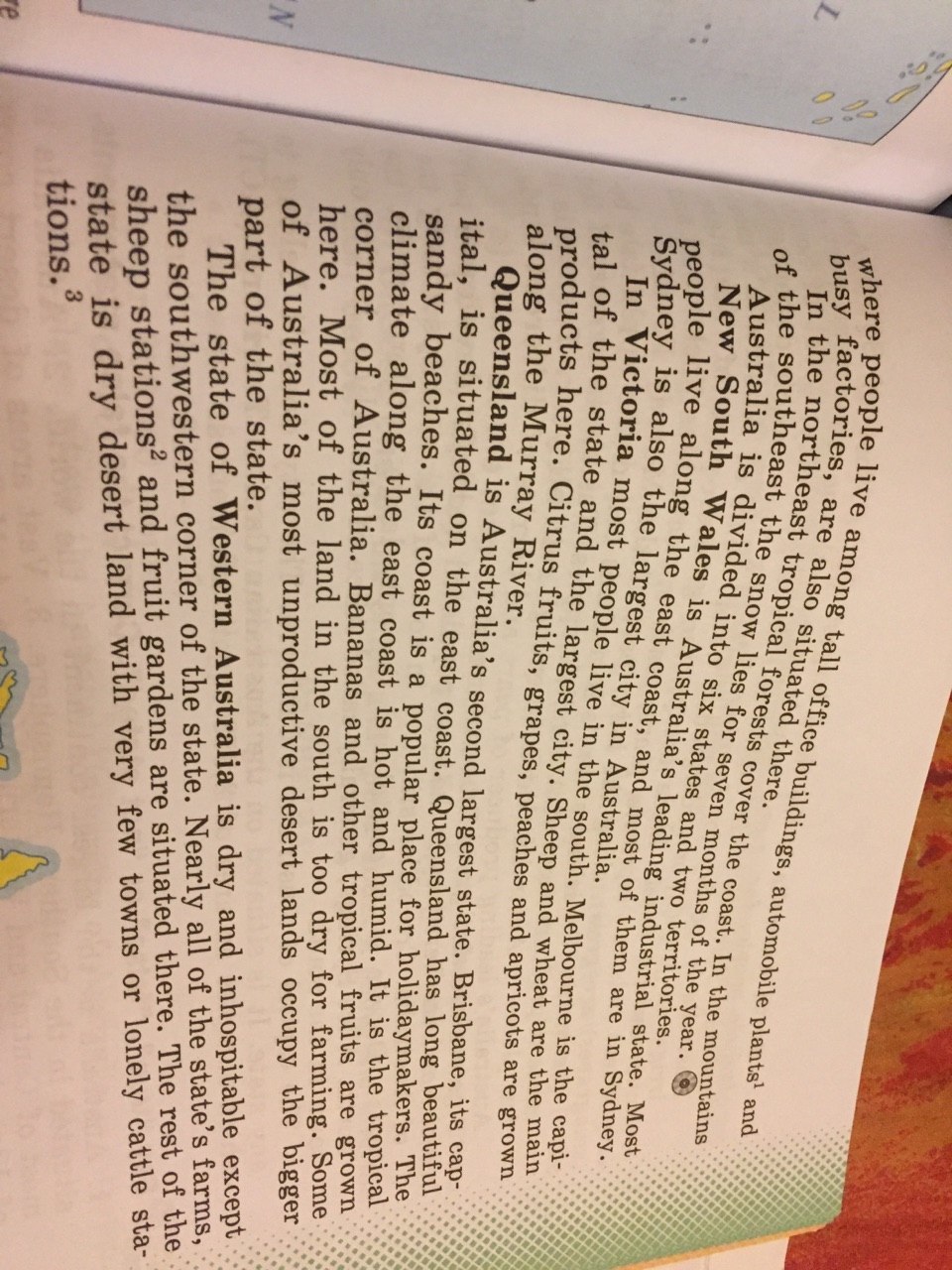 В Виктории большинство людей живут на юге. Мельбурн - столица штата и самый большой город. Овцы и пшеница здесь являются основными продуктами . На реке Мюррей выращивают цитрусовые, виноград, персики и абрикосы.Квинсленд - второй по величине штат Австралии. Брисбен, его столица, расположена на восточном побережье. В Квинсленде длинные песчаные пляжи. Его побережья - популярное место отдыхающих. Климат вдоль восточного побережья жаркий и влажный. Это тропический уголок Австралии. Здесь выращивают бананы и другие тропические фрукты. Большая часть суши на юге слишком сухая для ведения сельского хозяйства. Ряд самых непродуктивных пустынных земель Австралии занимают большую часть штата. Штат Западная Австралия засушливый и негостеприимный, за исключением юго-западного угла штата. Здесь находятся почти все фермы штата, здесь расположены овесные и фруктовые сады.