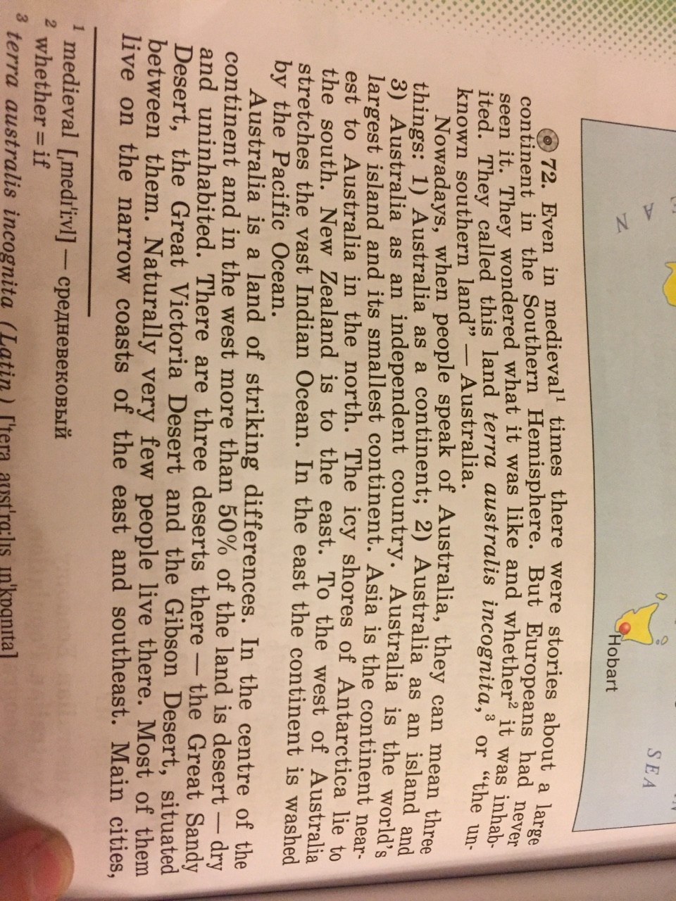В наши дни, когда люди говорят об Австралии, они имеют ввиду три вещи: 1) Австралия как континент, 2) Австралия как остров и 3) Австралия в качестве независимого государства. Австралия - самый большой остров в мире и самый маленький континент. К северу ближайший к Австралии континент - Азия. Ледяные берега Антарктиды лежат на юге Новая Зеландия - к востоку. К западу от Австралии простирается необъятный Индийский океан. На востоке континент омывается Тихим океаном. Австралия - земля разительных отличий(контрастов). В центре континента и на западе более 50% земли - пустыня - сухая и необитаемая. Здесь есть три пустыни: Великая Песчаная пустыня, большая пустыня Виктория и пустыня Гибсон, расположенная между ними. Конечно же, там живут очень мало людей.