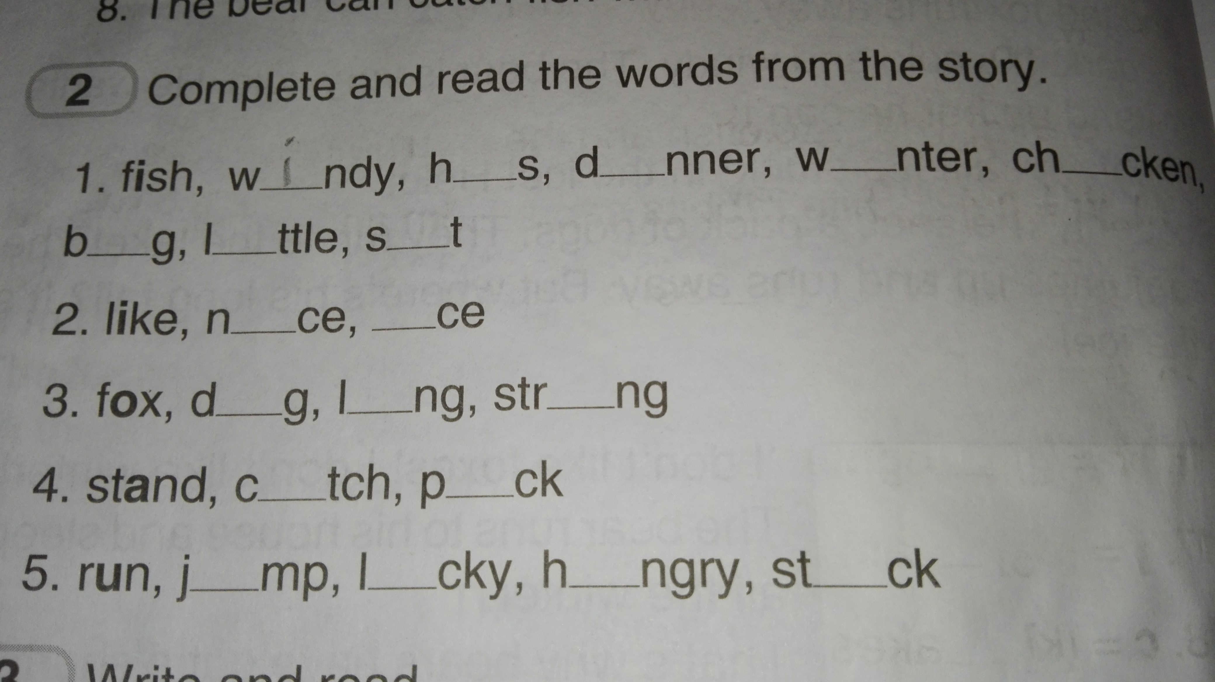 5.run,jump,lucky,hungry,stuck.