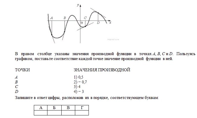На рисунке изображены график функции и касательные, проведённые к нему в точках с абсциссами A, B, C и D