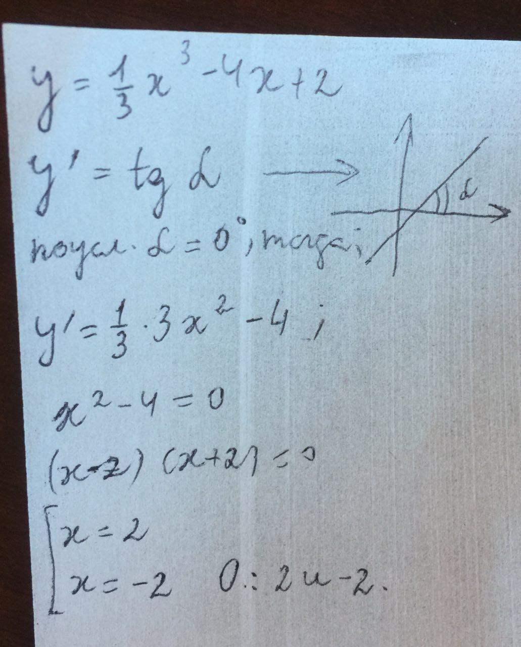 Дана функция y=⅓x³-4x+2. Найти абсциссы точек ее графика, в которых касательная к нему параллельна оси абсцисс
