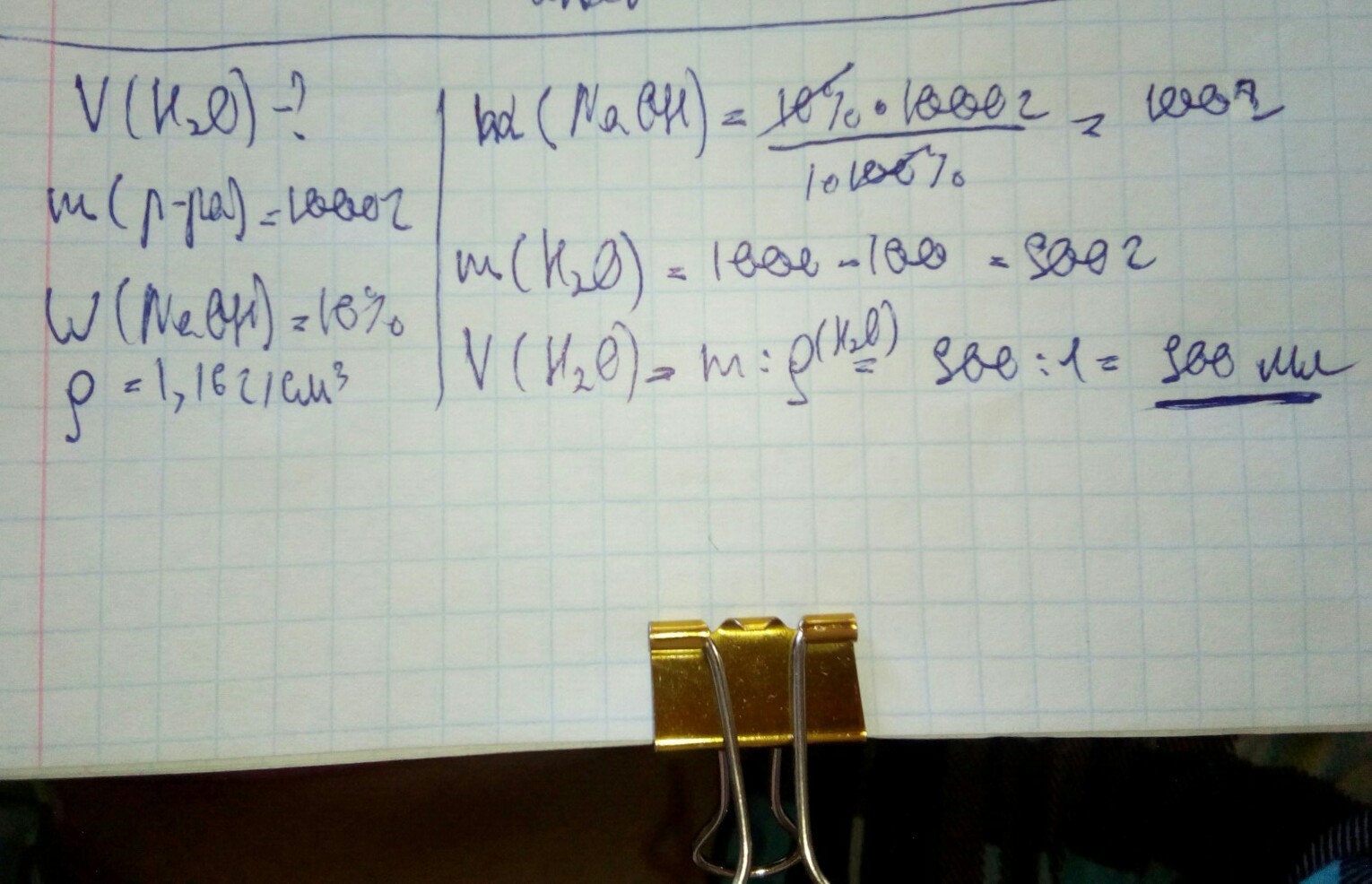Определите объём воды, необходимый для приготовления 10% раствора NaOH массой 1000 граммов с плотностью 1,16г/см³