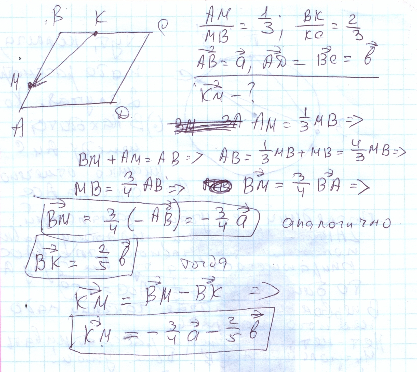 На сторонах AB и BC параллелограмма ABCD отмечены соответственно точки M и K так, что AM: MB = 1: 3, а BK: KC = 2: 3. Выразите вектор KM через векторы AB = a и AD = b.