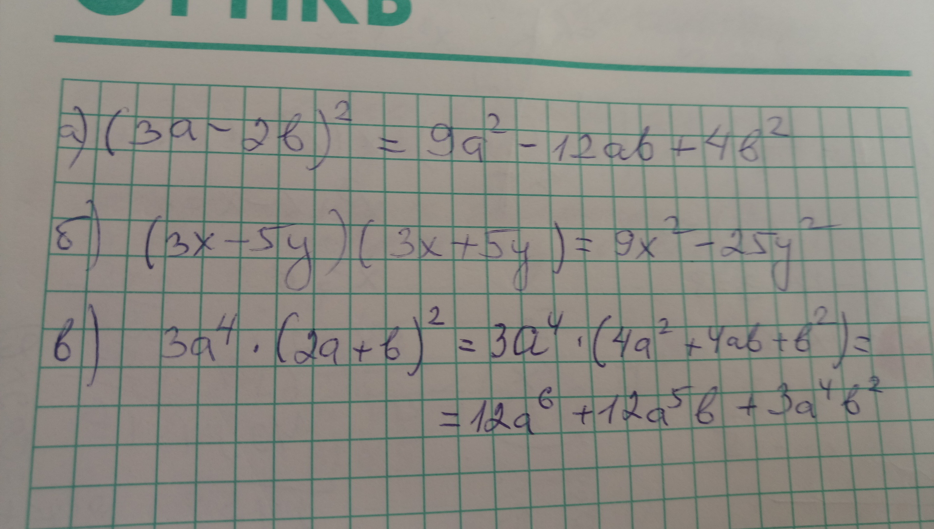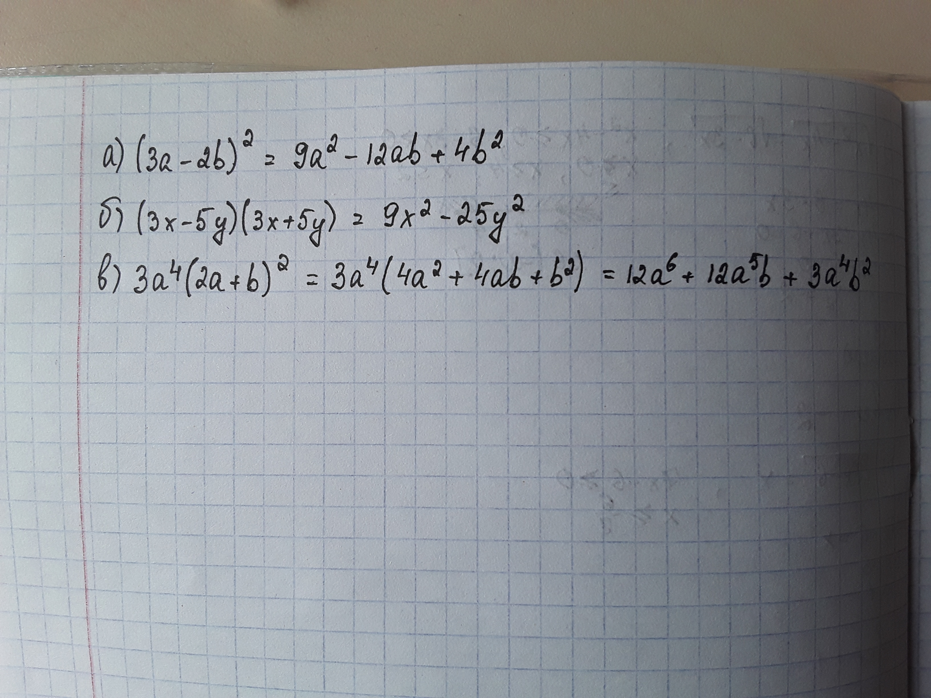 напишите в виде многочлена стандартного вида выражение; a) (3a-2b)^2 ; б) (3x-5y)(3x+5y) ; в) 3a^4(2a+b)^2