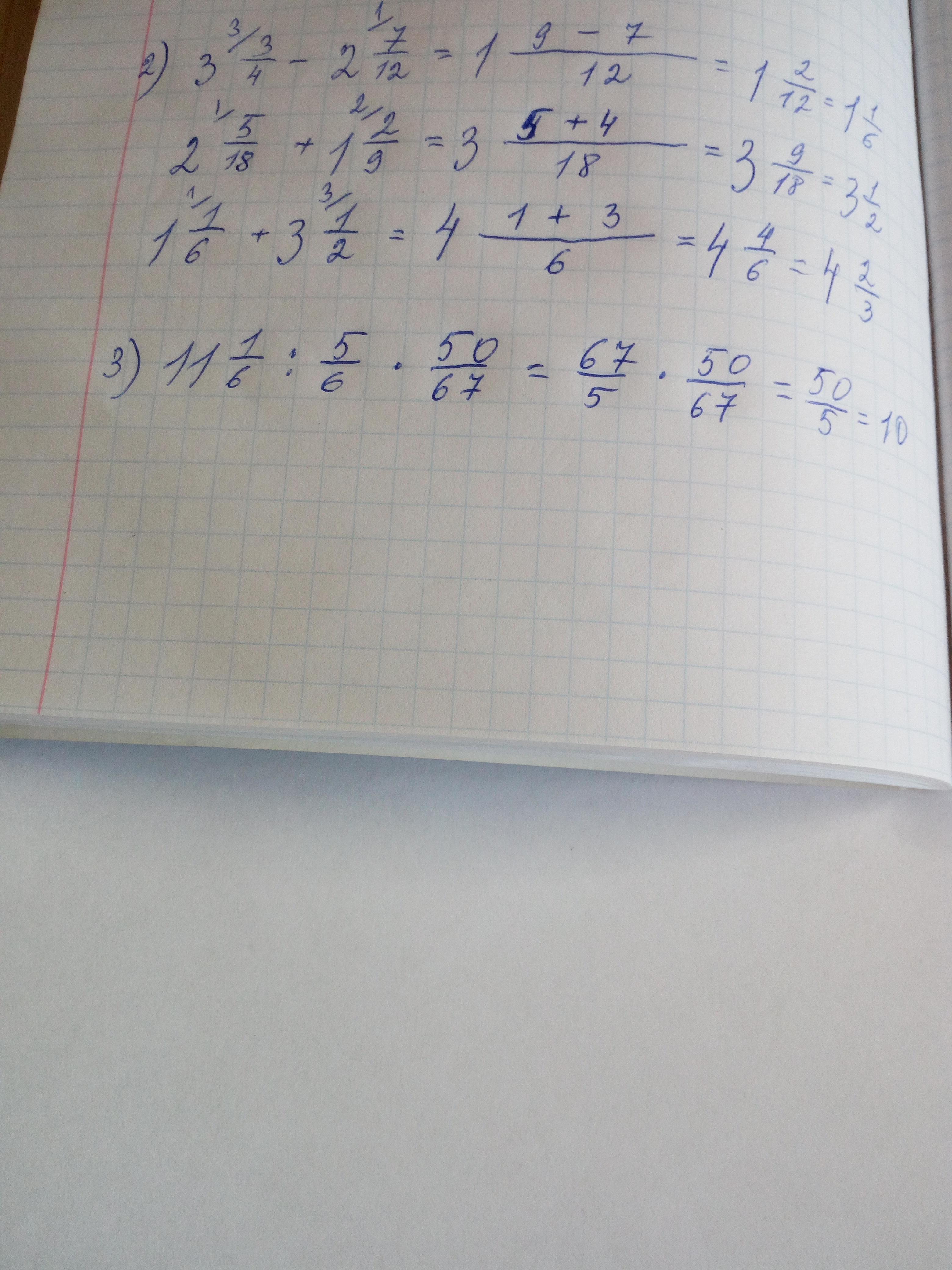 2) какое число получиться если к разности чисел 3-целых 3/4 и 2-целых 7/12 прибавит сумму чисел 2-целых 5/18 и 1-целая 2/9.