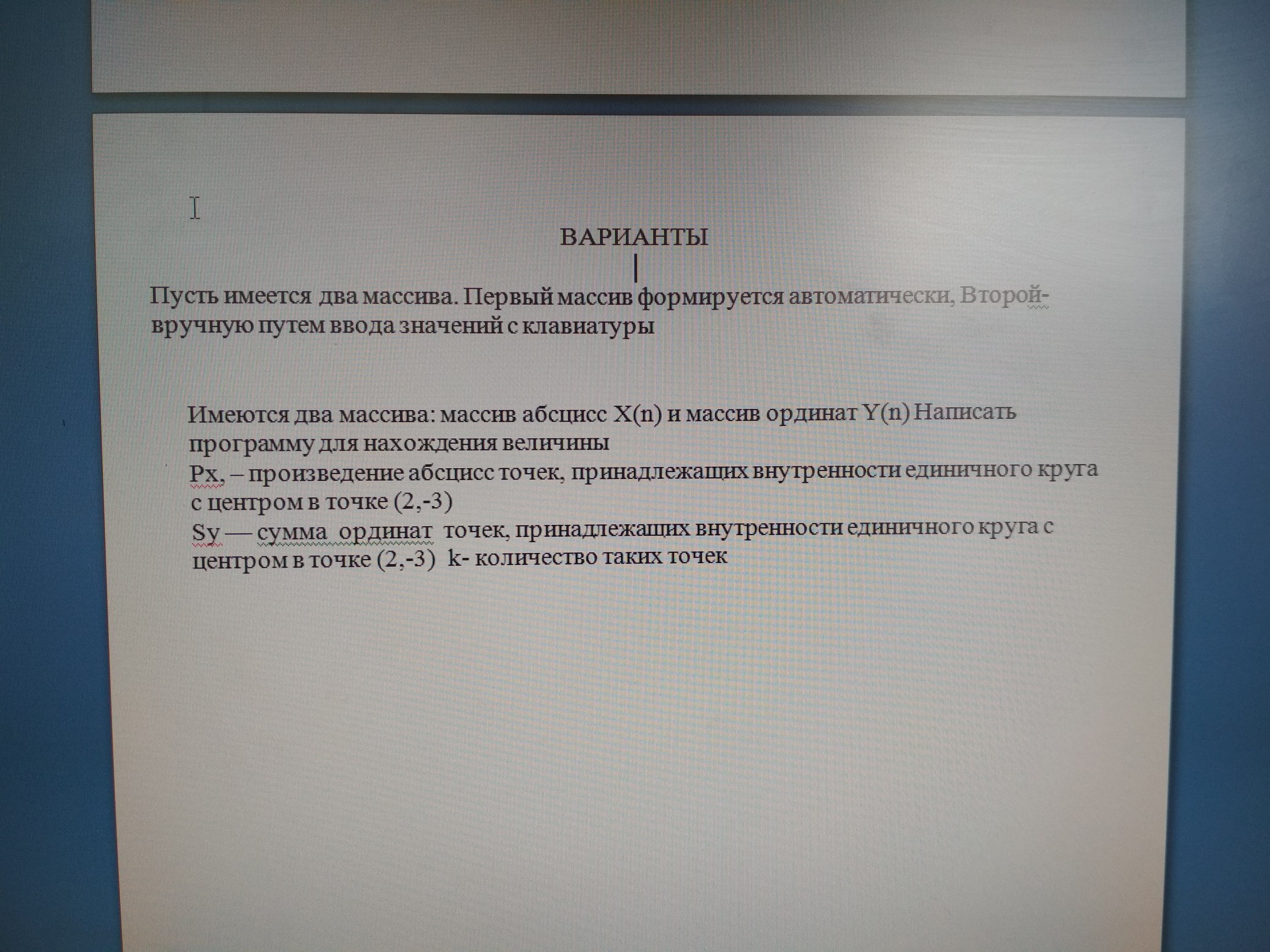 Единичный круг с координатами центра С(2;-3) вписывается в квадрат, у которого левый верхний угол будет иметь координаты (1;-2), а правый нижний - координаты (3;-4). Поэтому имеет смысл не брать границы абсцисс и ординат вне диапазонов, например, [0;4] и [-5;-1] соответственно. Значения в массиве абсцисс х сформируем с помощью датчика случайных чисел, значения в массив ординат у будем вводить с клавиатуры.