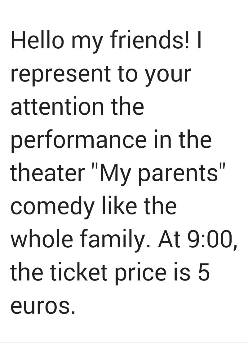 Уважаемые жители нашего города, представляю вашему вниманию кинотеатр "напиши что". Этот кинотеатр является многофункциональным, потому что если вы хотите пить вовремя, то нажав на кнопку Вы мгновенно принесете пить и так далее. Также в этом кинотеатре побывал Джонни Депп. И конечно же все волнует вопрос цены, к примеру если вы приедете сюда впервые то это будет бесплатно, а в следующий раз всего 300 рублей. Приходите к нам, Вы не пожалеете!!!
